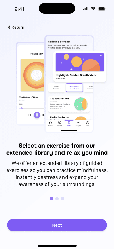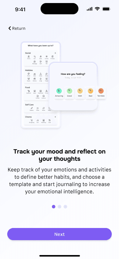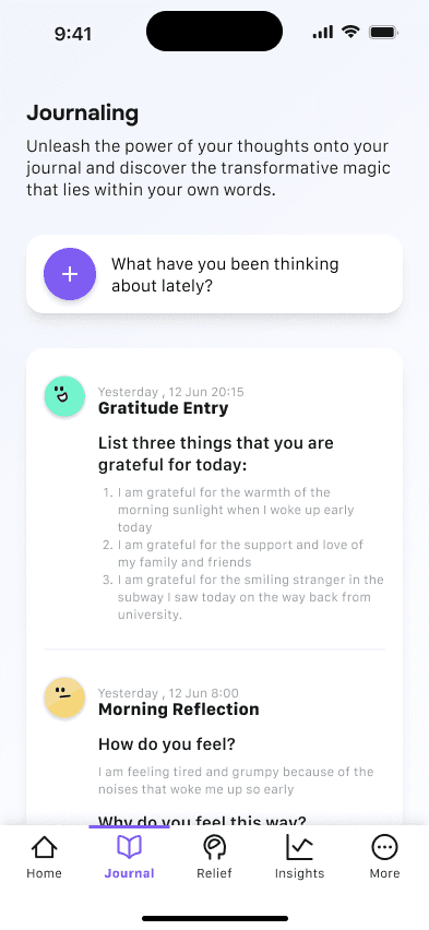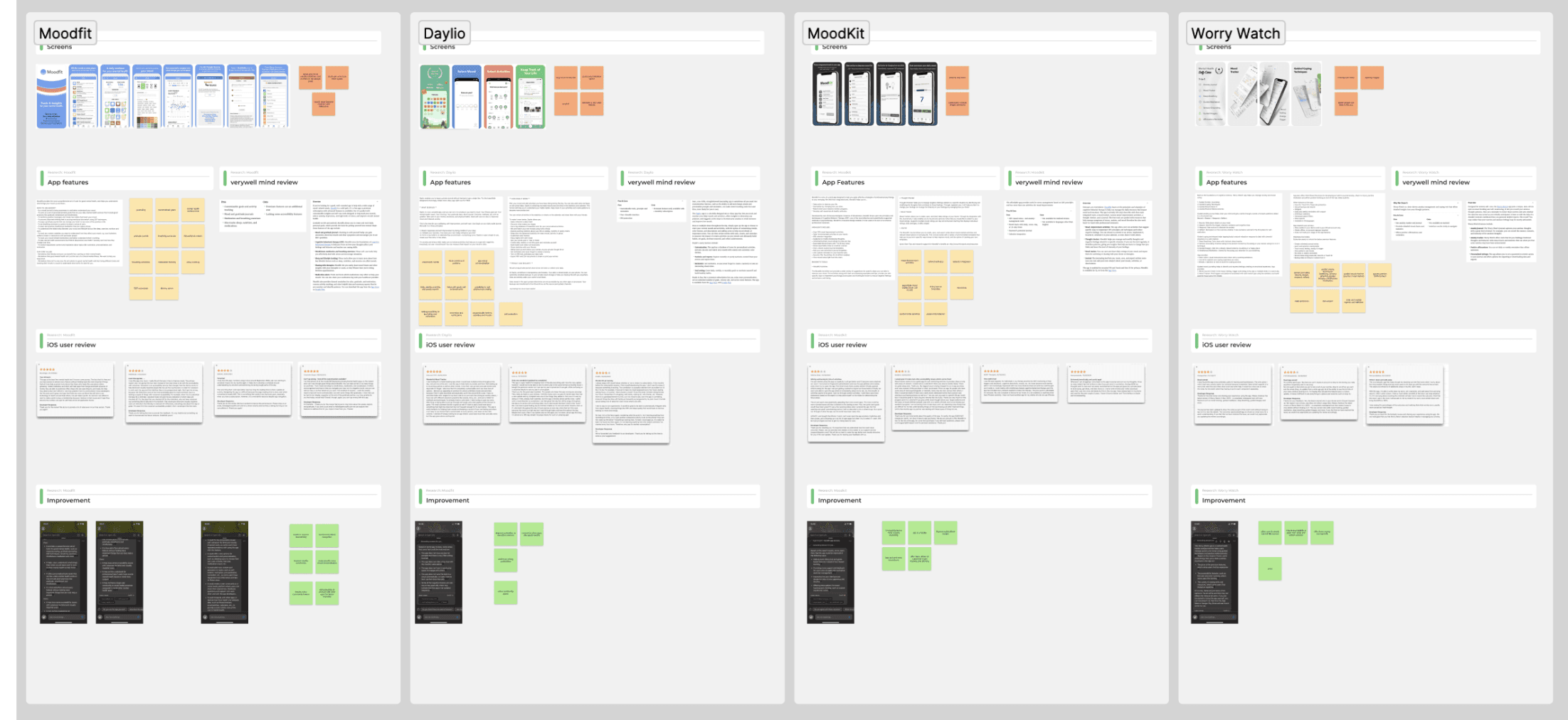 Competitive research was also conducted in order to evaluate the strengths and weaknesses of competitive mental health applications. Some of these competitors included Moodfit, Daylio, Moodkit, Worry Watch, Headspace, and Waking Up. Here I studied their interfaces, functionality, important features, and also user feedback from various platforms. This helped me not only identify some important features which would also be beneficial for my project but also some gaps and opportunities there too.