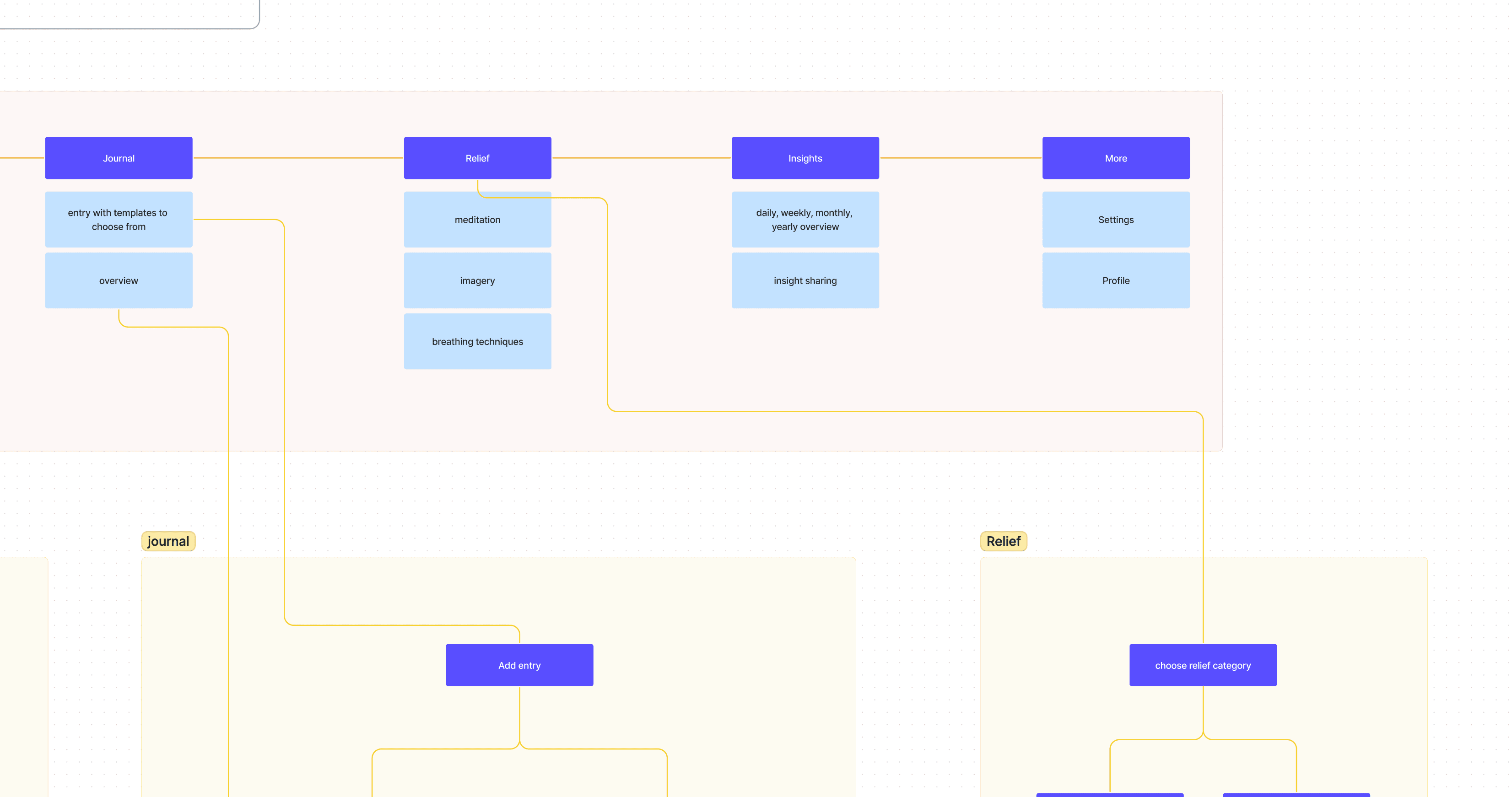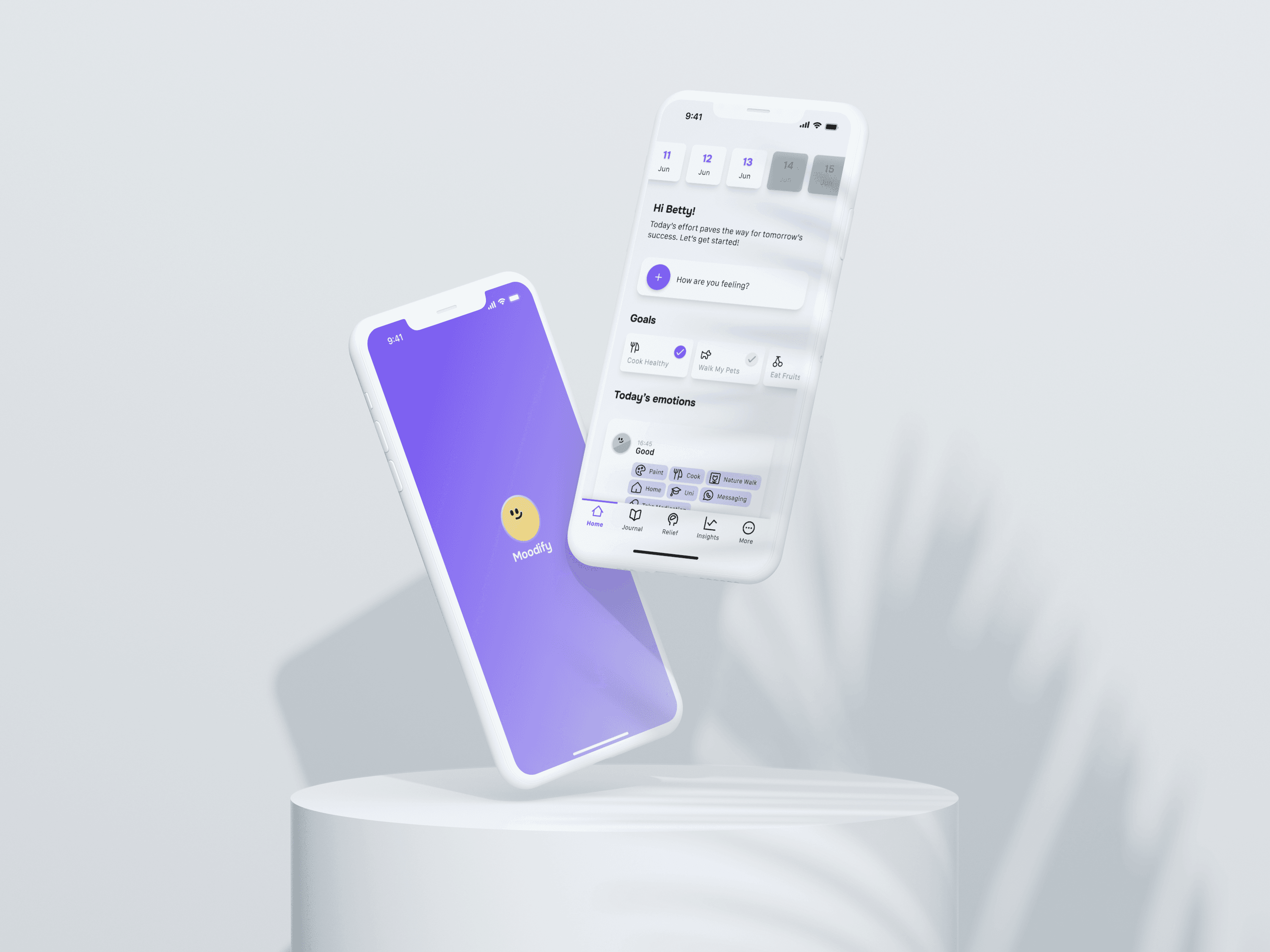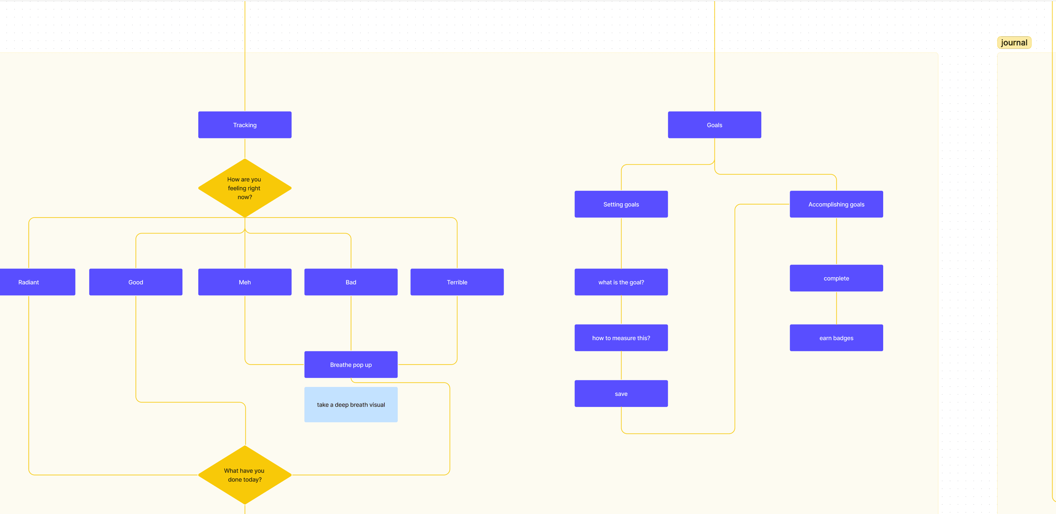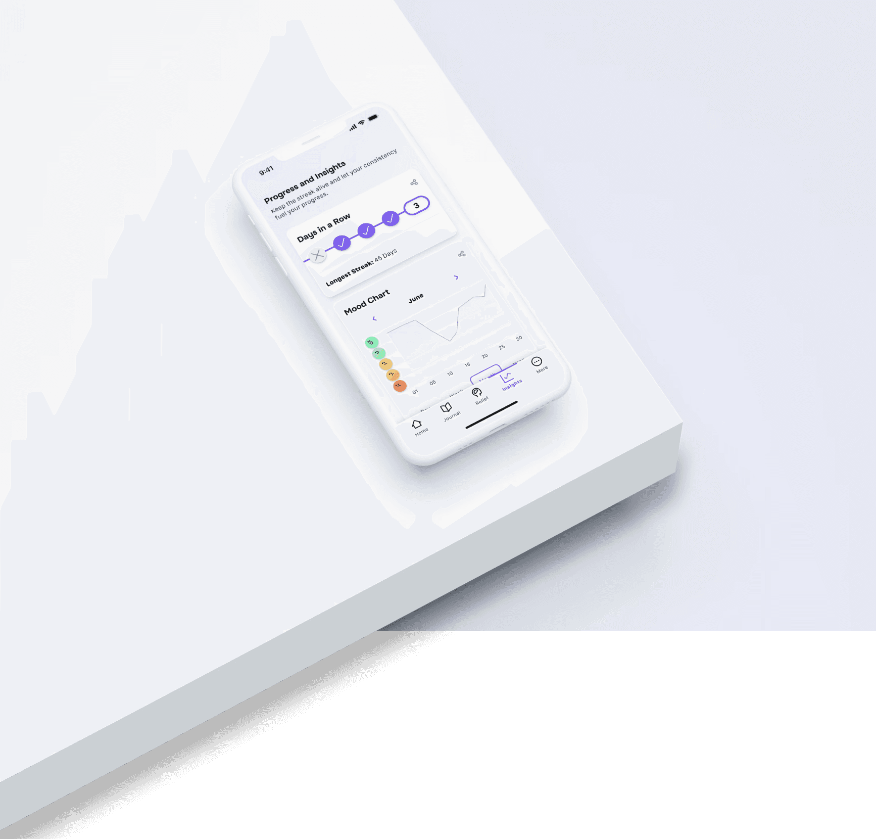 The ideating phase consisted of brainstorming, exploration and ideation, which allowed me to shape the information architecture, develop wireframes, and work on some visual explorations for this mood tracking app.