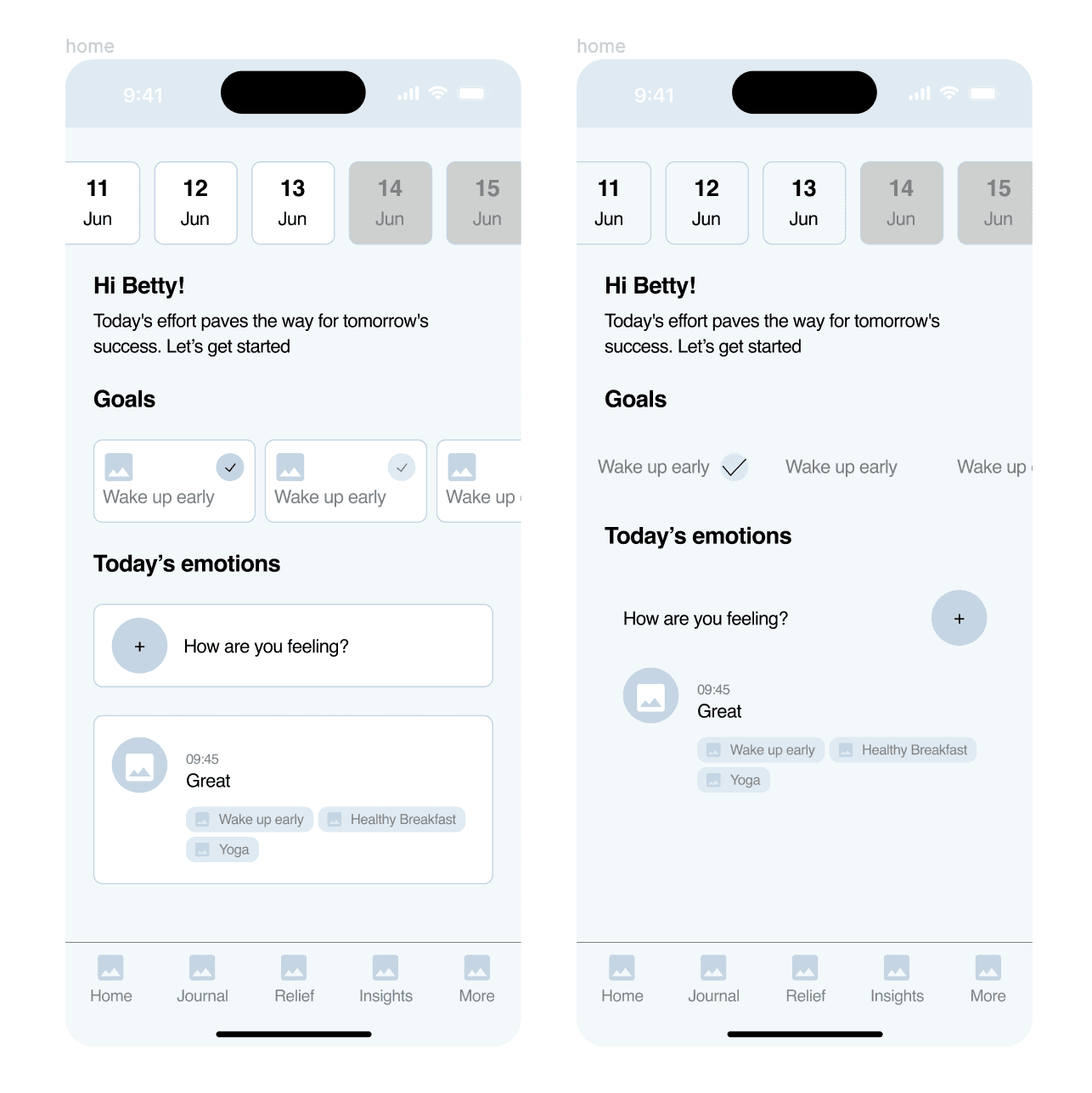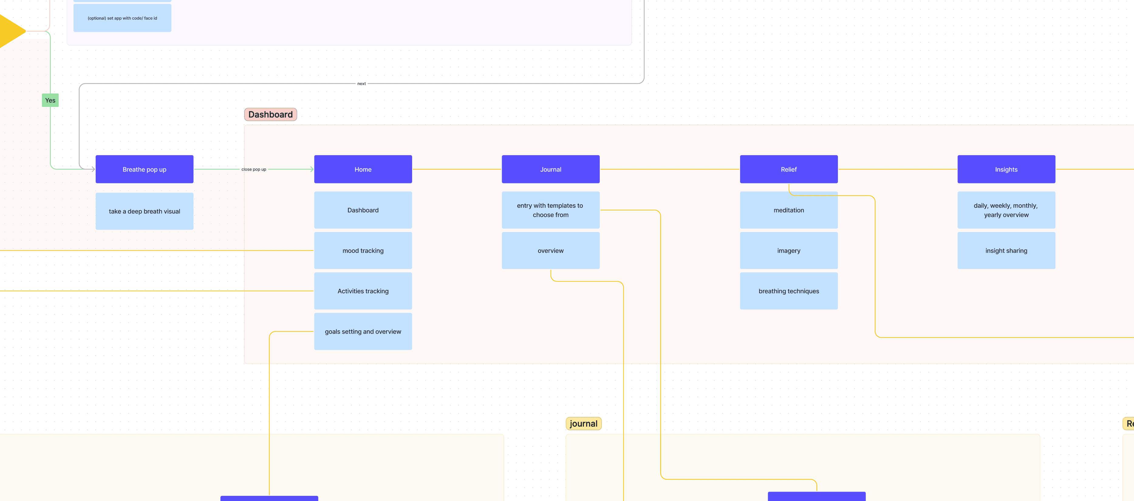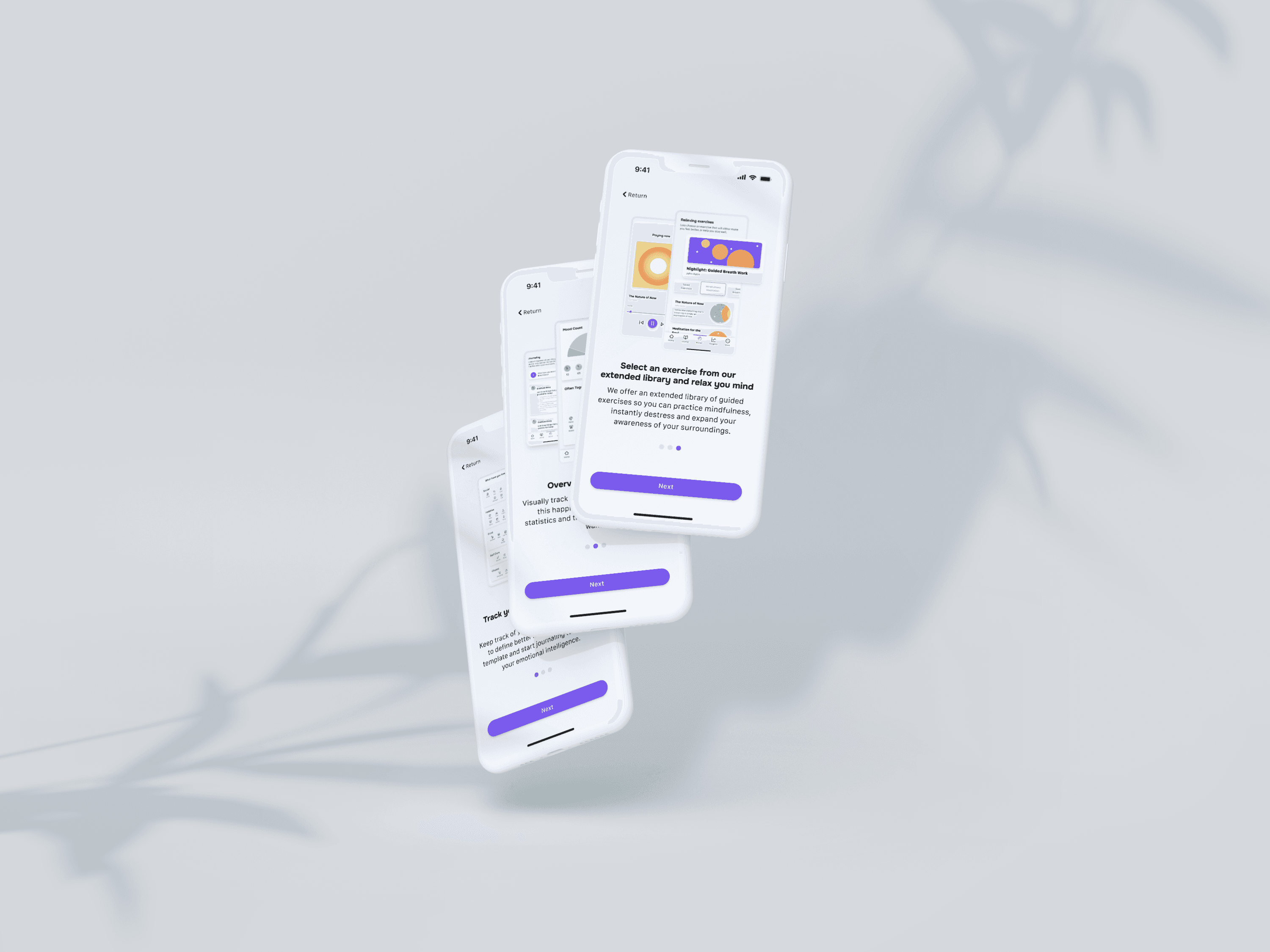 The ideating phase consisted of brainstorming, exploration and ideation, which allowed me to shape the information architecture, develop wireframes, and work on some visual explorations for this mood tracking app.