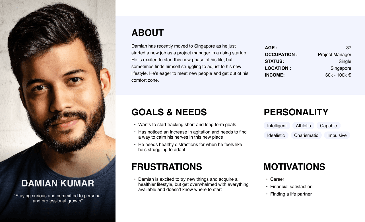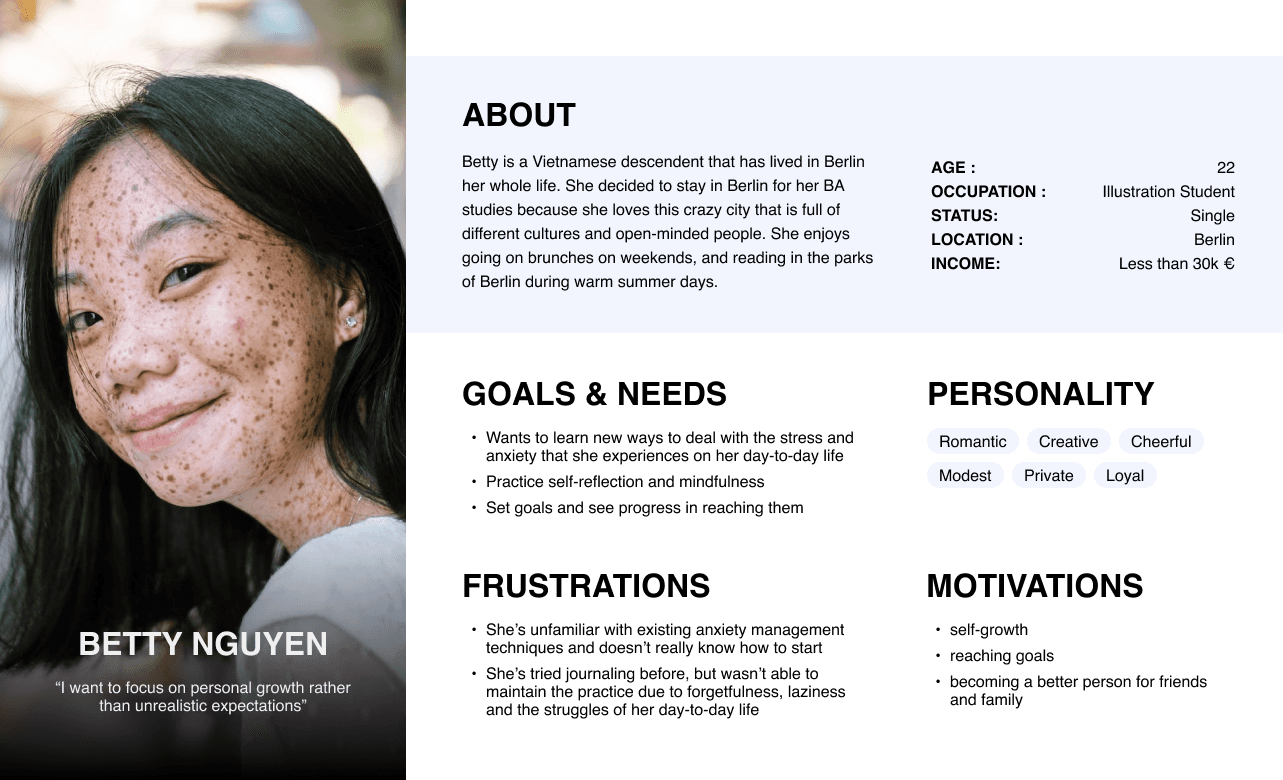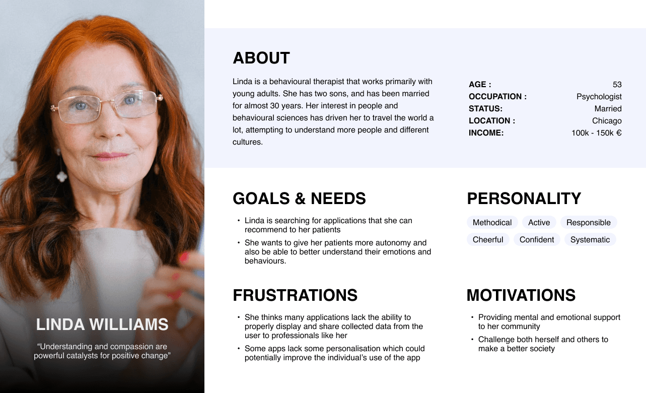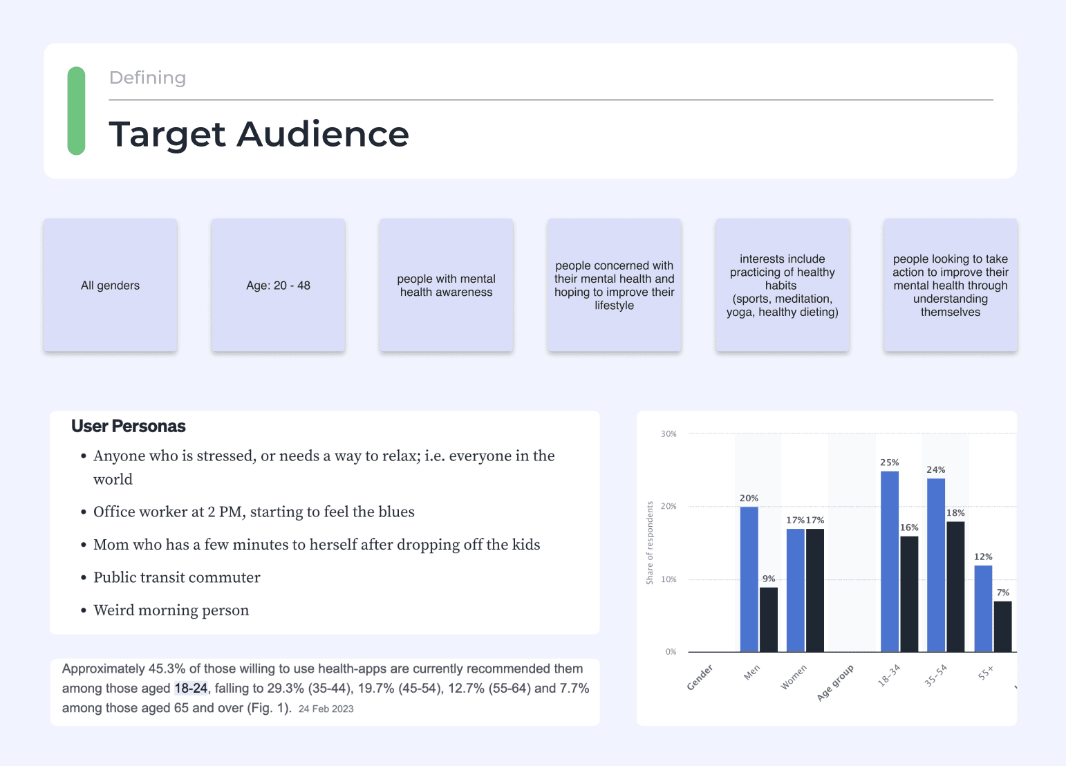 The defining phase of the design thinking process involved determining the user pain points, identifying the target audience, creating personas, and specifying some of the key features of this mood-tracking application.