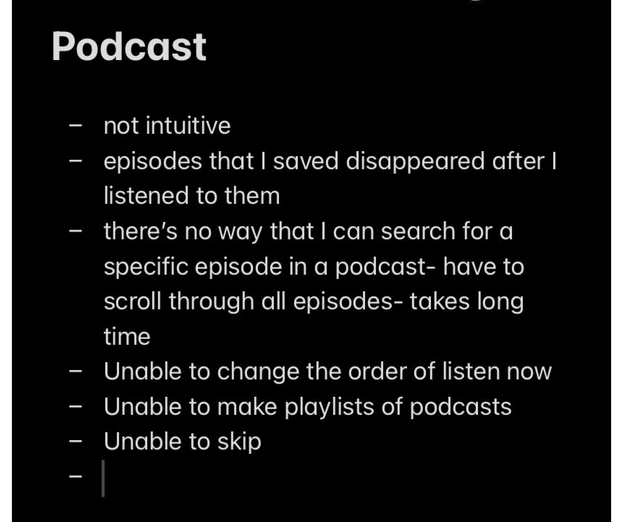 In my exploration of Apple Podcasts as a new user, I uncovered certain usability challenges that hindered the seamless enjoyment of the platform. Conversations with fellow podcast enthusiasts confirmed the existence of similar issues across different podcast applications. These challenges included difficulties in managing episodes, lack of personalisation options, and unintuitive navigation.